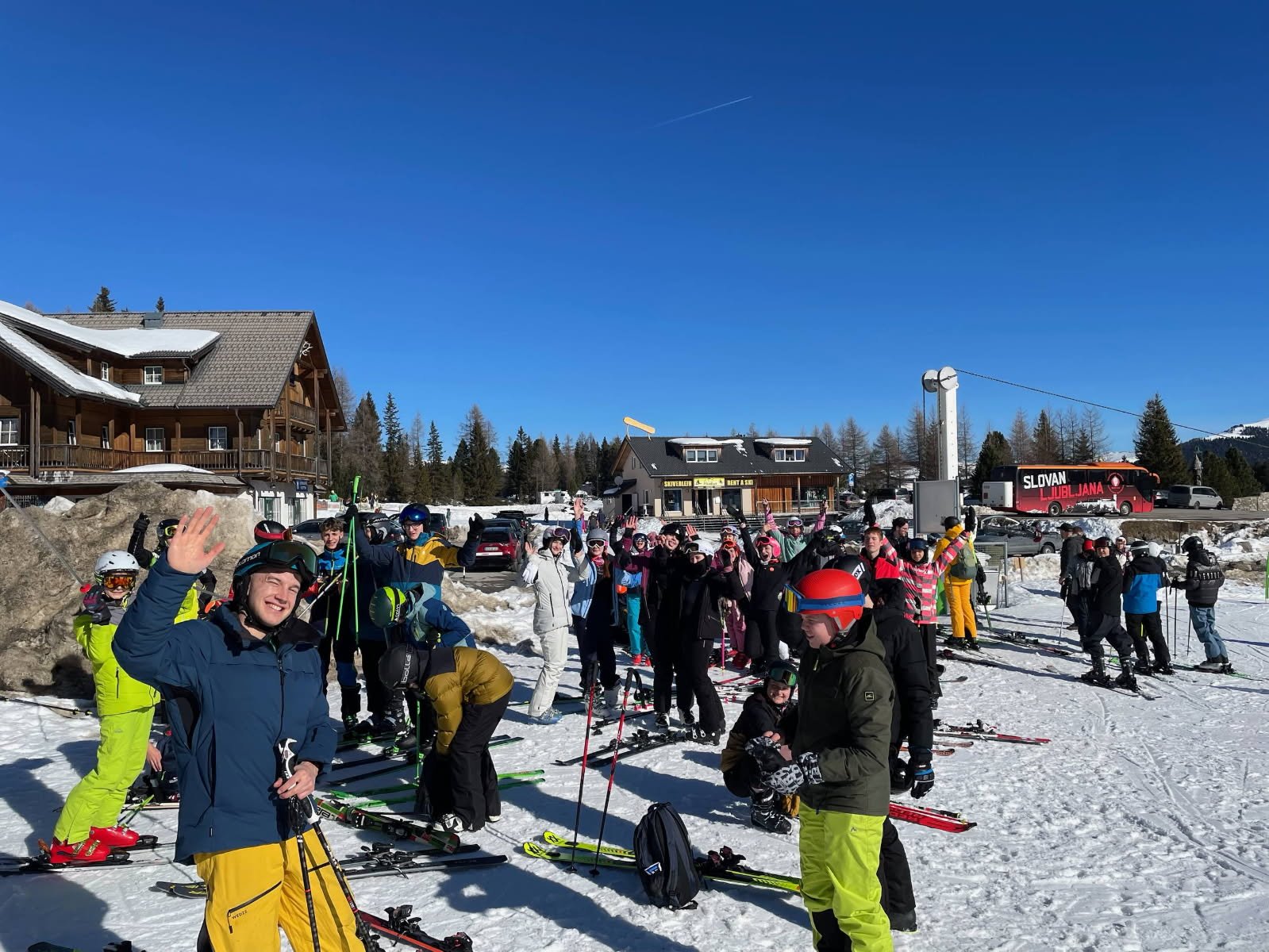 Učenci so srečno prispeli na smučišče Turracher Höhe in že z navdušenjem stopili na sneg. Dan so začeli v čudovitem vzdušju, polnem pričakovanj, smeha in dobre volje.